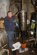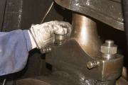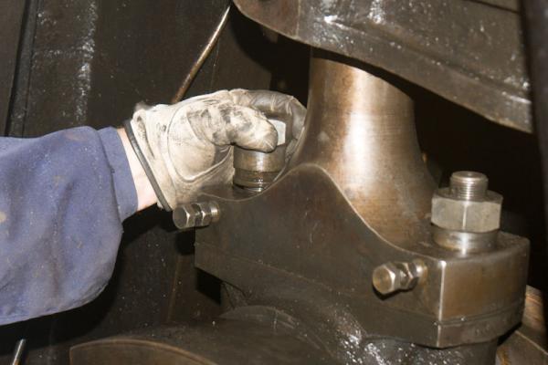 Inne i cylindern mynnar en oljeledning som smörjer kolven med olja från lubrikatorn. Oljan passerar kylvattenrummet mellan foder och motorblock via ett rör som leder från en mässingsmutter på utsidan av motorn. Det kan vara svårt att lossa muttern och få ut röret, men samma del hade tidigare lett till problem på en av de andra cylindrarna och det var därför viktigt att få loss det misstänkta röret.