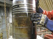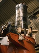 Kolven upptagen ur cylindern. Foto: Lennart FahlénNär topplocken plockades bort gick det att lyfta upp varje kolv med hjälp av den gamla traversen som finns i taket. Takhöjden tillät emellertid inte att kolvarna lyftes ur dieselmotorn helt och hållet utan de fick lyftas upp och stå kvar ovanpå motorn, uppallade på träbitar.