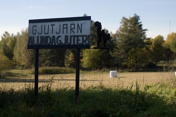 Gjuteriets skylt.Kontakt togs med ett litet gjuteri i Alunda som lovade att med en gammal ratt som förlaga kunna gjuta en ny. Leveranstiden blev c:a två månader beroende på att de endast gör en gjutning varannan månad och då gjöt man totalt 4 ton gods. Resultatet blev mycket bra och ratten kunde användas utan vidare justering eller bearbetning.