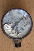 Nygjord skala. Foto: Linda.Manometrarnas grundfunktion var visserligen hel men skalan på vilken man avläser aktuellt lufttryck hade i många fall krackelerat och gjort det mer eller mindre svårt att tyda vad visaren pekade på. Mätarna lämnades därför till Manometerfabriken i Leksand för att renoveras. Där kalibrerades de och nya skalor ritades, fast i en tidsenlig stil.