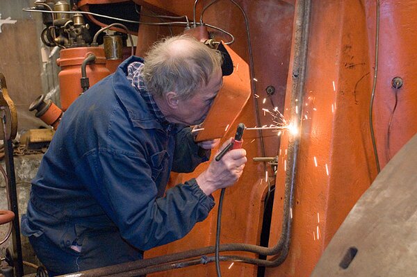 Bengt svetsar ihop gamla rör.Rören har ofta en komplicerad form med många böjar för att passa in mellan två punkter utan att vara i vägen. De gamla rören som ledde tryckluft från flaskorna till motorn var för rostiga för att kunna användas. De avlägsnades i sin helhet från motorn och användes som mallar när de nya skulle tillverkas för att dessa skulle få precis samma böjning.