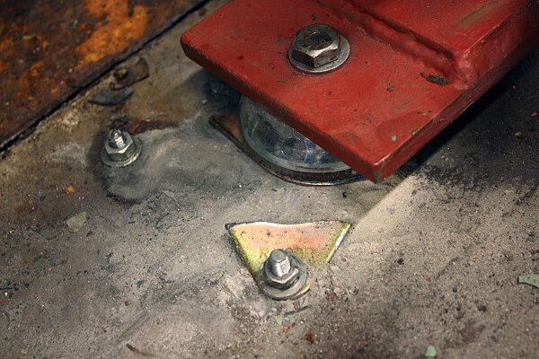 Fundamentets fästen har gått av. Foto: Peter.När kompressorn arbetade blev kraften i den så stor att den hoppade och skakade mycket våldsamt. Förankringen i golvet skakade sönder och hela apparaten, med kompressor, elmotor och ram, hoppade runt på golvet med ett enormt oväsen. Den kommer att behöva fästas på något annat och bättre sätt. Ett annat stort problem var att en säkerhetsventil på kompressorn öppnade sig efter en stunds körning och att kompressorn inte förmådde skapa ett så högt lufttryck i flaskorna som förväntat. Kanske var kompressorn i alltför dåligt skick för att kunna användas?