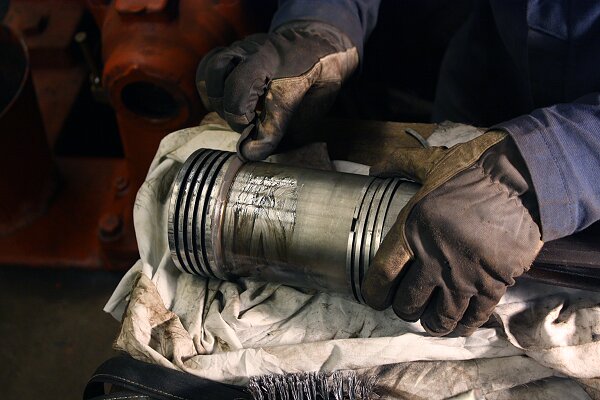 Smärgelduk på kolven. Foto: Peter.Kolven hade väl skurit någon gång tidigare och nu höll den inte tätt längre mellan det lägre och det högre trycket i cylindern vilket kan göra att säkerhetsventilen öppnar sig. Men frågan var hur detta skulle åtgärdas. Byta ut hela kolven eller bara kolvringarna? Eller var kanske hela kompressorn så dålig att det vore bättre att skaffa en annan? Det var i alla fall lättare och billigare att köpa nya ringar än en helt ny kolv så det blev metoden att pröva och det är trots allt ringarna som i huvudsak står för tätningen i cylindern. Kolvringar beställdes från tillverkaren i Tyskland och under tiden rengjordes och slipades kolven varsamt.