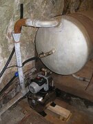 Ny pump och gammal tank.Tidigare hade en kompressor införskaffats för att kunna fylla tryckluftsflaskorna med komprimerad luft som behövs för start och bränsleinsprutning. När systemet för tryckluft, med luftflaskor och rör, började komma på plats blev det så småningom dags att även installera kompressorn. Den monterades på golvet intill dieselmotorn, elektricitet och strömbrytare installerades och en modern vattenpump köptes in för att ge kylvatten till den. Pumpen kopplades till en gammal tank som hade fyllts med vatten via en slang.