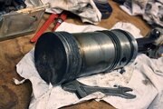 Kompressorns kolv är hårt sliten. Foto: Peter.Olika former av felsökning vidtog. Luckorna öppnades på kompressorn för att kunna göra rent bättre. Speciell uppmärksamhet ägnades åt tillförseln av kylvatten. Det upptäcktes att elmotorn drev kompressorn åt fel håll mot det föreskrivna så detta åtgärdades. Men ingenting hjälpte för att kunna köra apparaten med tillfredsställande resultat utan att säkerhetsventilen öppnades. Ett beslut togs därför att demontera kolven. Det är kolven som genom rörelsen i cylindern bygger upp det höga trycket i kompressorn. Kolven såg verkligen inte bra ut när den kom fram. Ringarna satt fast och både dessa och kolvens yta var ojämna och repiga.