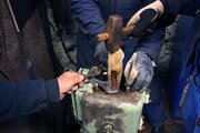 Improviserad montering av kolv som kräver många händer. Foto: Peter.De nya kolvringarna monterades utan bekymmer. Men istället uppstod problem när kolven skulle föras tillbaka ned i cylindern. På samma sätt som beskrivits för återmonteringen av kolven på dieselmotorn så tog ringarna emot även på kompressorn. Även i detta fall gjorde bristen på lämpliga specialverktyg att en annan lösning måste improviseras fram. Genom att hålla ner och vrida in plattjärn mellan kolv och cylinder så trycktes den fjädrande ringen in tillräckligt för att kolven skulle kunna bankas ned bit för bit.