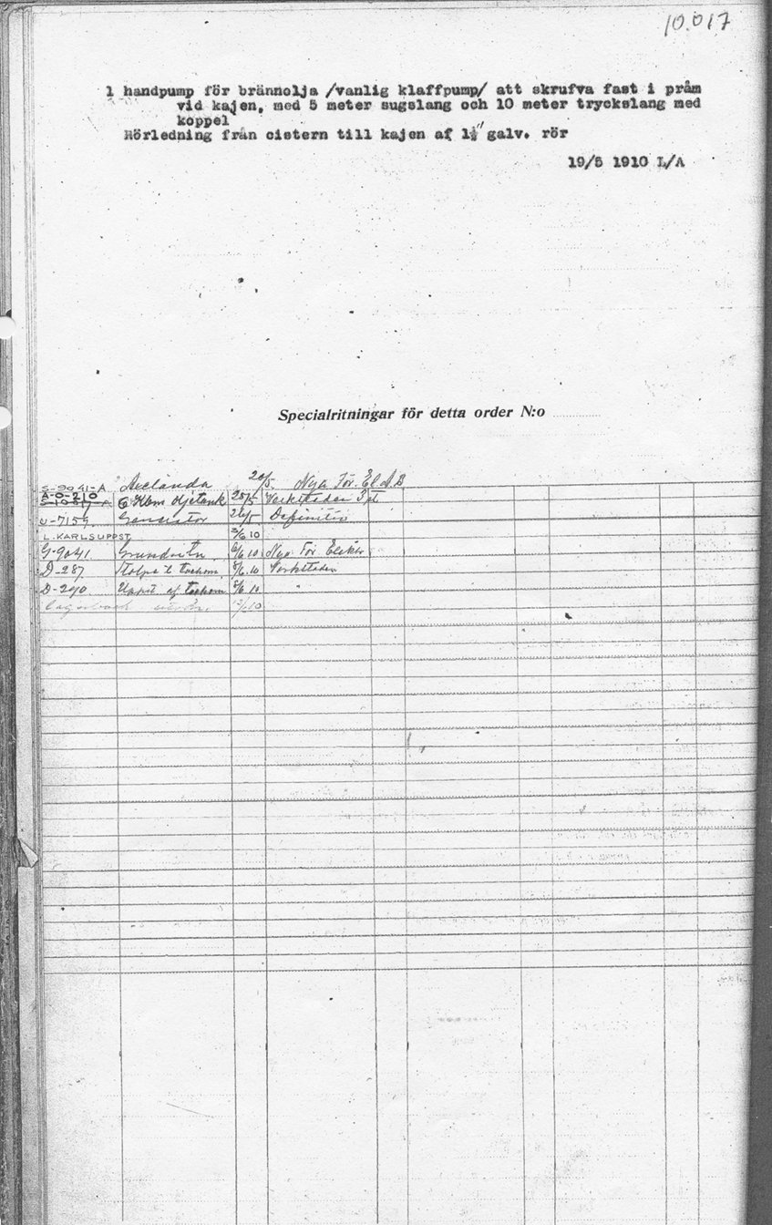 BeställningssedlarNär dieselmotorerna skulle köpas in till fästningen skrev leverantören ett par beställningssedlar över vad som blivit överenskommet med kunden. De ger oss idag en värdefull inblick i hur leveransen utformades för dessa specifika motorer. De utgör också ett spännande tidsdokument från år 1910 och gör dem värda en närmare presentation.