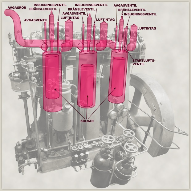 Till varje cylinder hör flera ventiler som tillsammans verkställer förbränningens cykel enligt fyrtaktsprincipen. När en kolv är på väg ner är insugningsventilen öppen för att få in luft i cylindern. Luften tas från det omgivande rummet genom luftintagen som egentligen bara är ett metallrör med spaltöppningar i. Kolven trycker ihop luften framför sig när den rör sig uppåt. Den komprimerade luften i cylindern blir mycket varm, ca 500°C. Då öppnas bränsleventilen som med hjälp av tryckluft blåser in diseloljan i den komprimerade luften vars värme gör att bränslet antänder. Förbränningen trycker ner kolven igen och rörelseenergi skapas. Det som blir kvar är avgaser och nästa gång kolven rör sig uppåt igen trycks de ut genom avgasventilen och vidare genom avgasröret. Cylinder nummer ett, längst åt höger, har även en startluftsventil där tryckluft skjuts in för att vid uppstart sätta kolvarna i rörelser.
