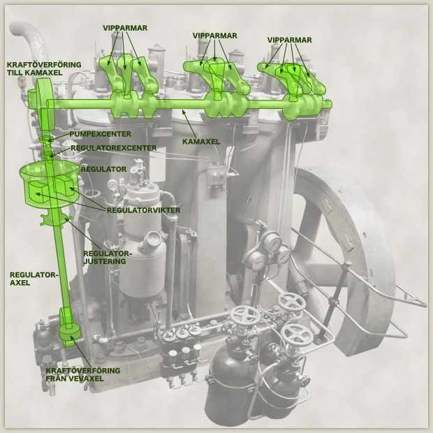 Motorns rotation driver runt regulatoraxeln och regulatorn via en kraftöverföring från vevaxeln. I regulatorn finns två regulatorvikter som trycks utåt från axeln när hastigheten ökar. Deras avstånd från axeln avgör läget på regulatorexcentern i förhållande till pumpexcentern. Pumpexcentern rör sig fram och tillbaka med regulatoraxelns rotation och är kopplad till bränslepumpens pumpkolv. På samma sätt driver regulatorexcentern bränslepumpens regulatorkolv. Det är förhållandet mellan excentrarna som bestämmer hur stor del av pumpslaget som ska vara öppen för bränsle och därmed regleras motorns effekt. Motorns hastighet bestämmer alltså hur mycket bränsle som pumpas in till förbränningen. Det här förhållandet går även att påverka manuellt genom den ratt för regulatorjustering som sitter under regulatorn. Regulatoraxelns rotation går vidare genom en kraftöverföring till kamaxeln så att även den roterar. Kamaxelns hjul trycker upp vipparmarna vid precis rätt läge för att öppna och stänga de olika ventilerna på varje cylinder.