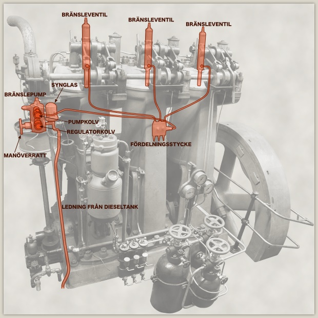 Som bränsle idag används det som kallas dieselolja, men förr kunde det vara olika oljor av skiftande kvalitet som gick under det gemensamma namnet brännolja. På motorns bränslepump sitter en manöverratt som gör det möjligt för maskinisten att styra om bränsle över huvud taget ska pumpas in i motorn. Bränslet går i ledningen från dieseltanken och passerar ett synglas på vägen in till pumpen. Inuti pumpen finns en pumpkolv som först suger upp dieselolja från tanken och sedan trycker den vidare ut till cylindrarna. Det är regulatorkolven som avgör hur stor del av dieseloljan som släpps vidare i varje pumpslag och på så sätt regleras effekten. När bränslet kommer till fördelningsstycket delas det upp i tre olika ledningar, en för varje cylinder, innan det når bränsleventilerna på cylindrarnas topplock. När bränsleventilerna öppnas tar tryckluften med sig dieseloljan ner i cylindrarna där det förbränns.